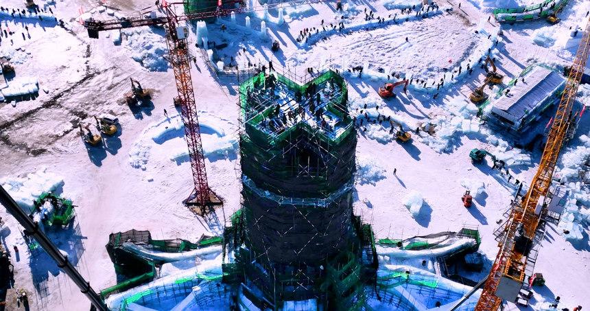 12月8日晚,第24届哈尔滨冰雪大世界园区主塔“冰雪之冠”完成封顶,进入最后的细节打磨和灯光调试阶段。